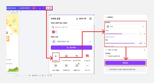 우측 상단 [공유] → [다운로드]를 선택하고, 파일형식은 [JPG]가 가장 적합합니다.