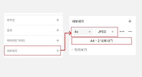디자인 작업이 마무리된 후에는 프레임을 선택한 후 우측 메뉴에서 [내보내기]선택, 옵션에서 [4X], [JPEG]를 선택후 [내보내기]버튼을 눌러 저장합니다.
