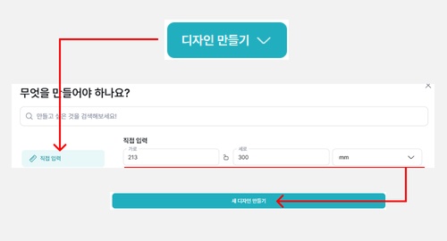 로그인 후 [디자인 만들기]를 선택후 메뉴중에 [직접 입력]를 선택합니다.
