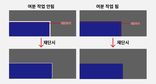 새로운 캔버스 생성시에 작업사이즈가 아닌 재단사이즈로 만들었을시에는 여분 작업이 되지않아, 인쇄후 재단시 밀림이 발생하여 원치않는 흰 여분이 불규칙 하게 나오게 됩니다.