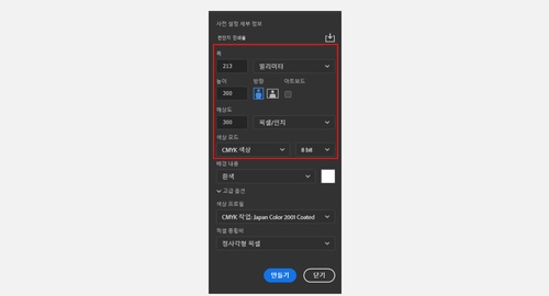 신규 페이지를 만들때는 [색상 프로필]부분에서 [CMYK 작업: Japan Color 2001 Coated]를 선택하면 됩니다.