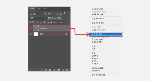 레이어에서 텍스트 레이어를 선택후 우클릭하면 나오는 메뉴에서 [문자 레스터화]를 선택하여 문자 레이어를 이미지레이어로 전환 합니다.