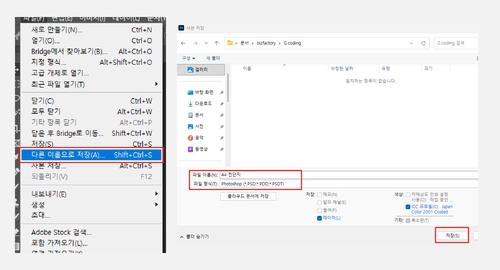 작업 완료 후 모든 데이터는 반드시 저장 시 확장자는 PSD, JPEG, PNG로 저장하시기 바랍니다. PDF로 바로 저장하는 경우 다른 프로그램에서 오픈 시 검정색상으로 변경되는 오류가 발생하거나 색상변차가 발생하므로 주의하시기 바랍니다.
