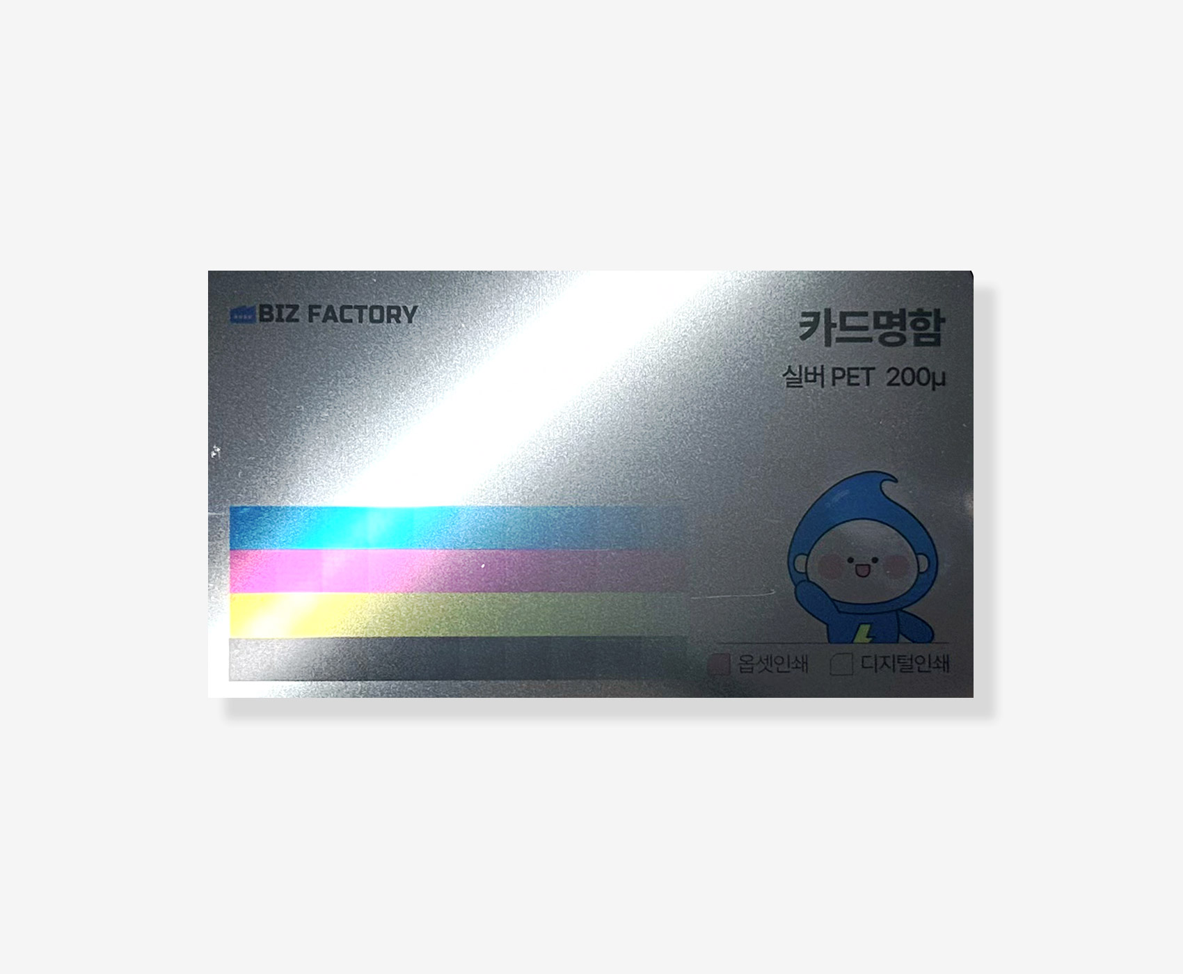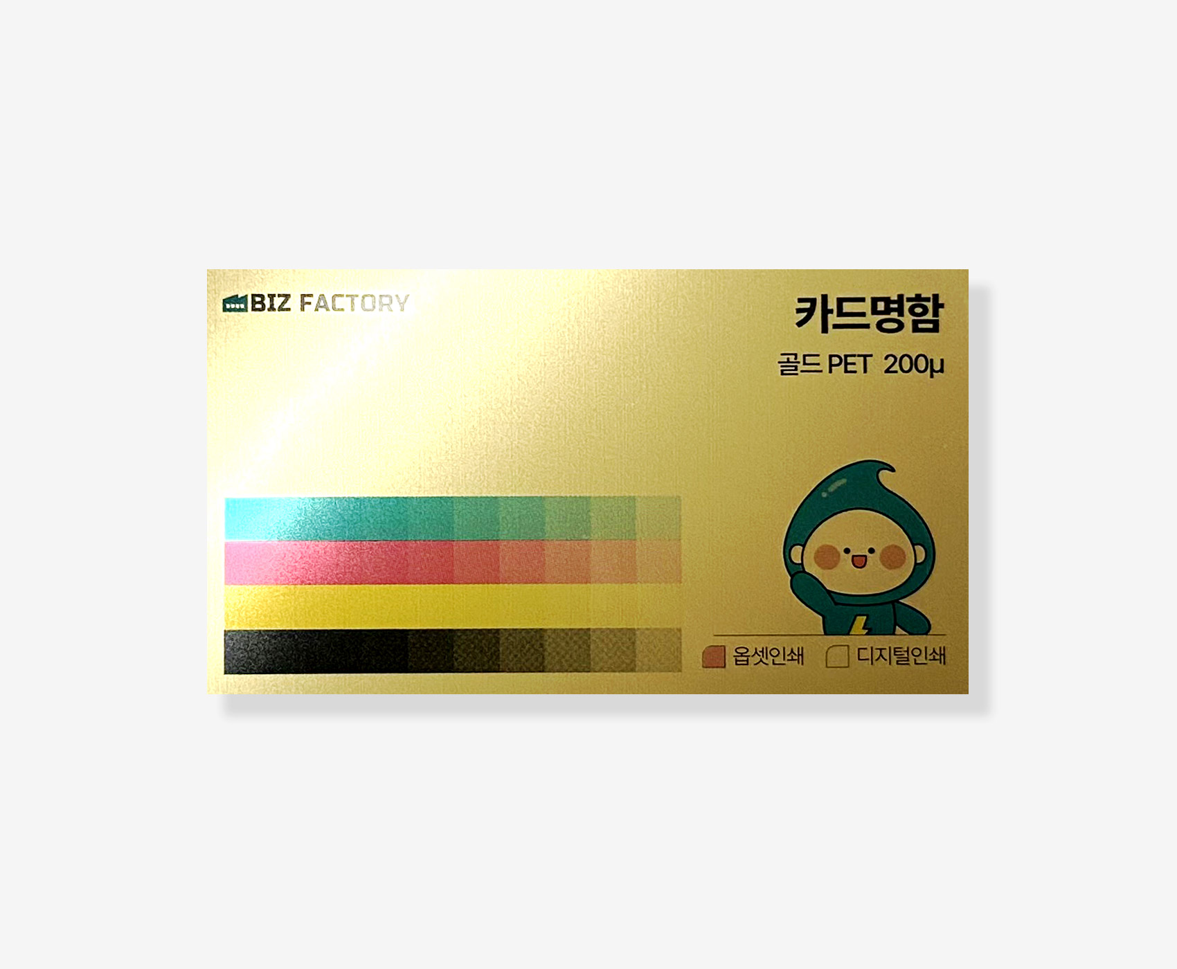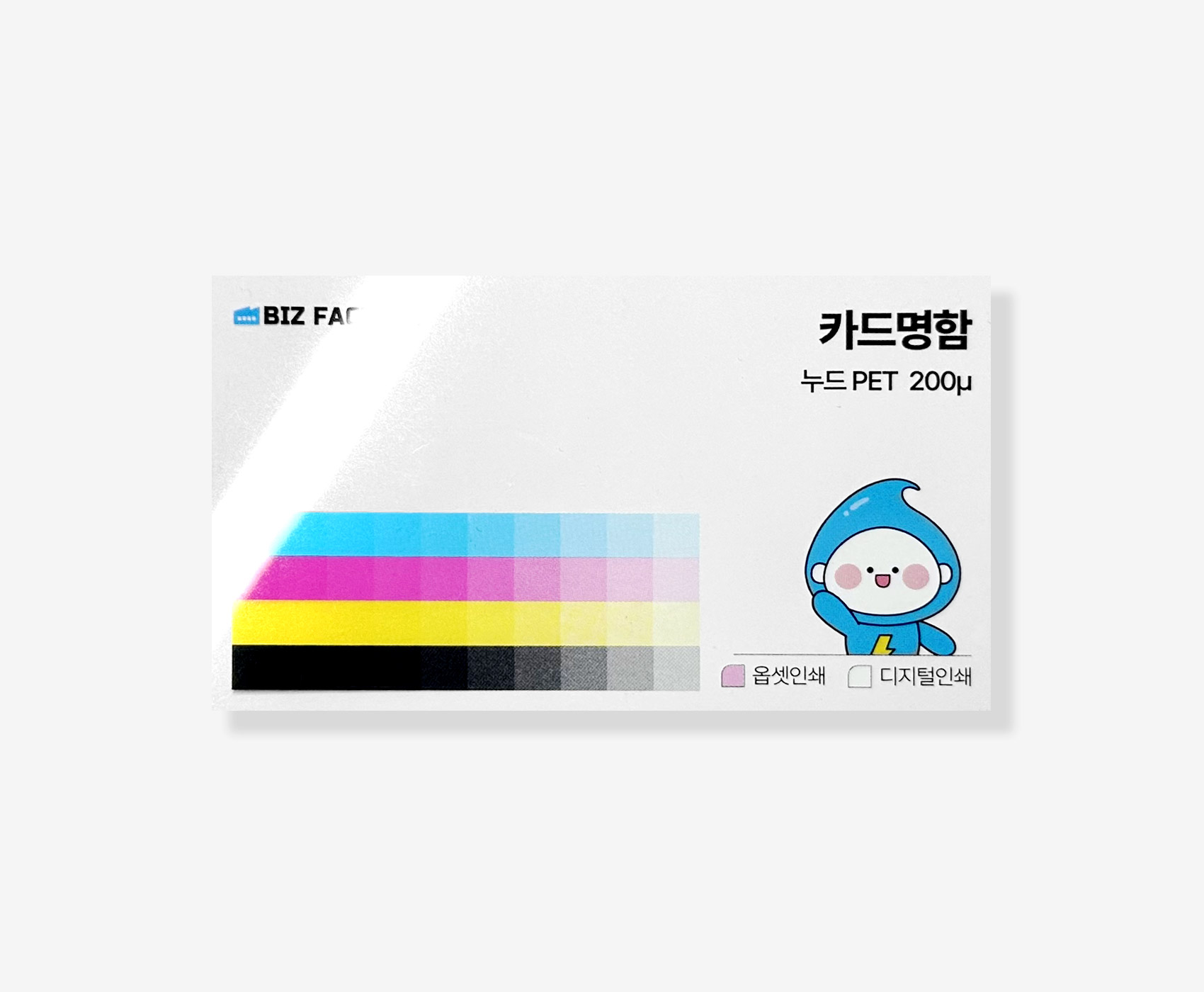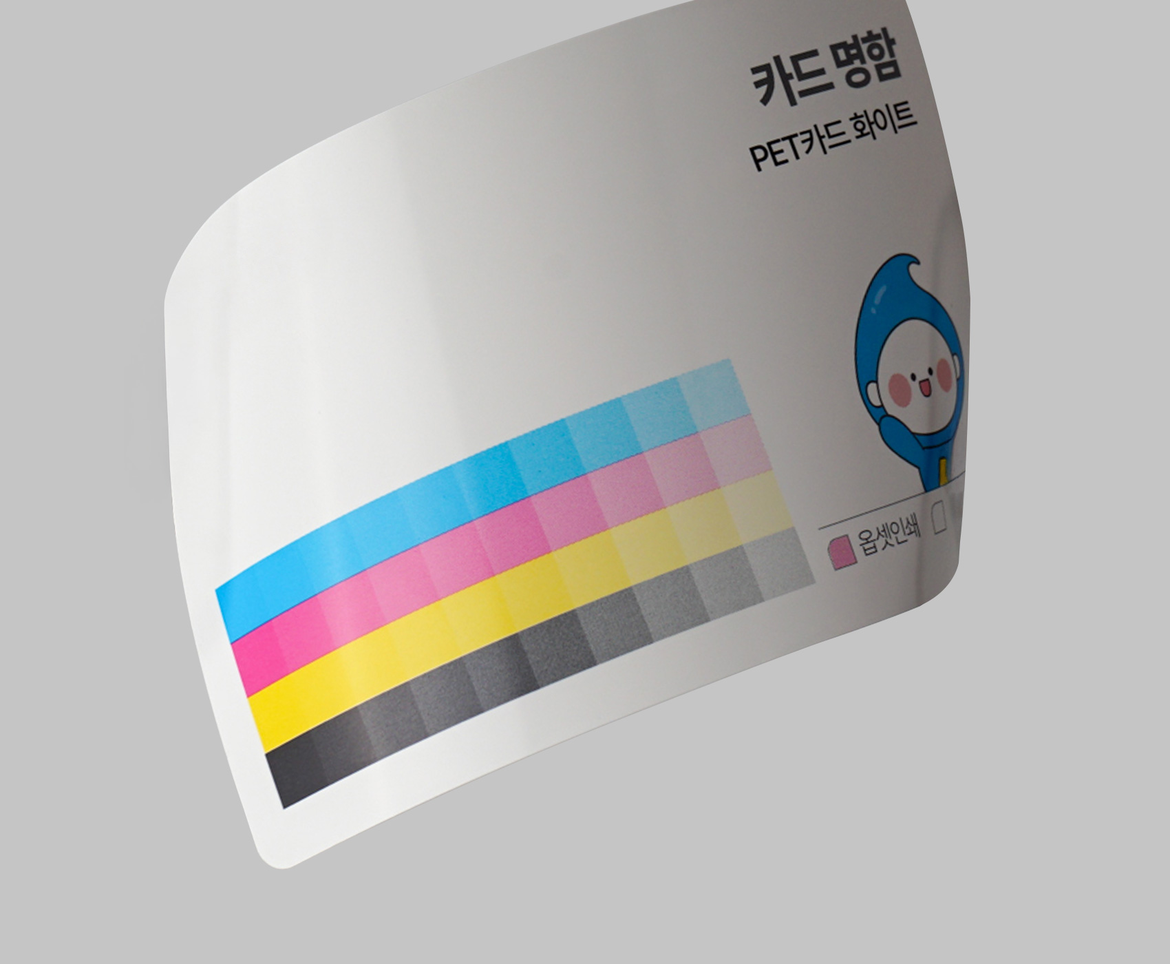• 검정(K100%)색 인쇄시 카드재질(PET)의 경우 종이에 인쇄한 색상보다 20% 정도 진하게 느껴질 수 있으며 원단의 특성상 앞면이 좀 더 진하게 인쇄됩니다.