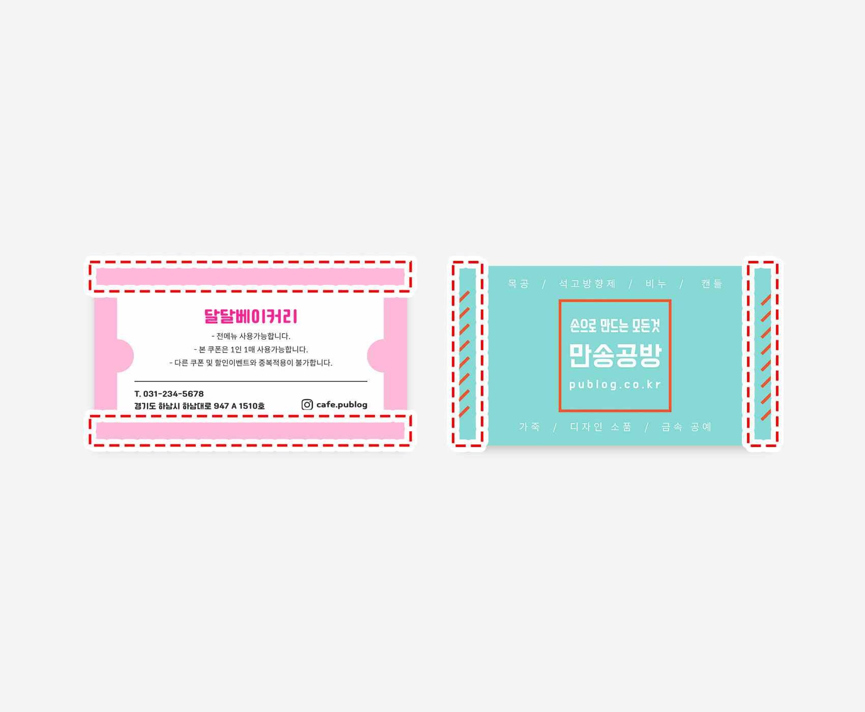 - 일러스트, 인디자인에서 PDF로 저장 시 반드시 서체아웃라인 처리후 작업사이즈로 저장하시기 바랍니다.