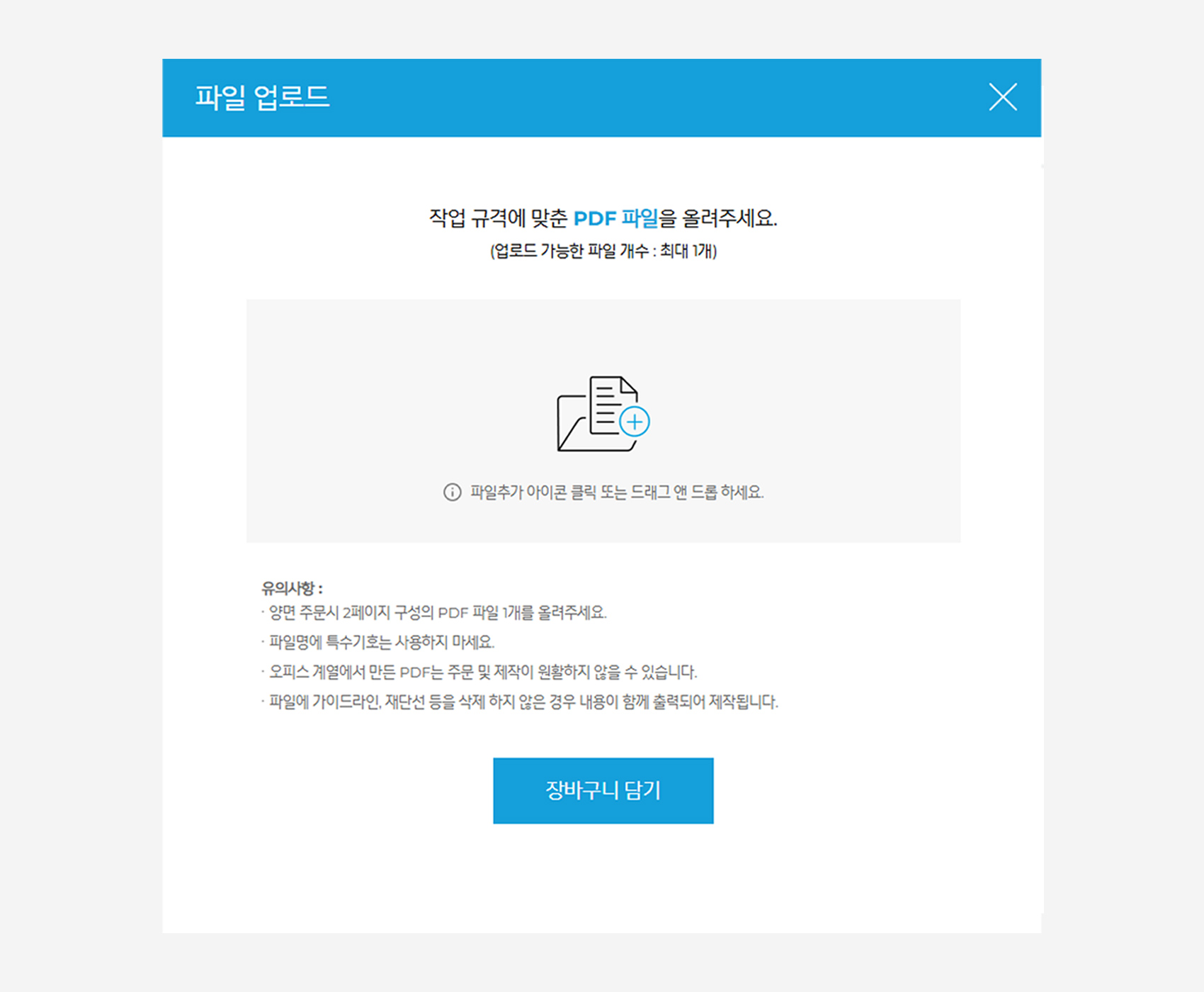 - 오피스 계열의 프로그램에서 작업하여 저장한 PDF 주문의 경우 제작이 원활하지 않을 수 있습니다.